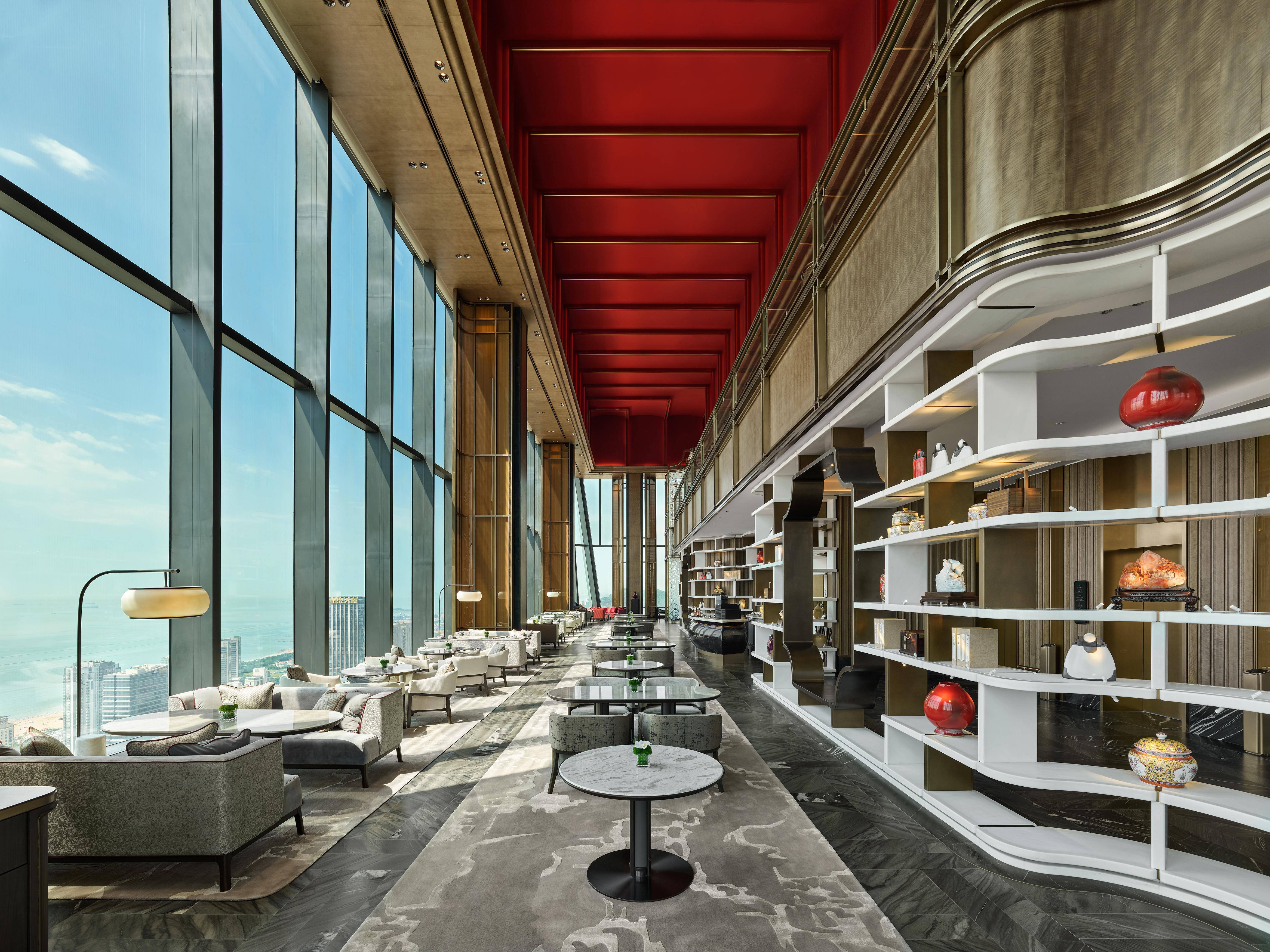芳菲苑于云端之上呈现从容雅致的尊邸气度,三层挑高的空间以落地窗引入天光与海色,石老人海景尽收眼底;设有可容纳104位宾客的开放式空间及一间12人包间。宝蓝大理石地面与午夜蓝曲线墙面交织出深邃韵致,刺绣白色耐冬花瓣点缀其间,流露东方典雅。