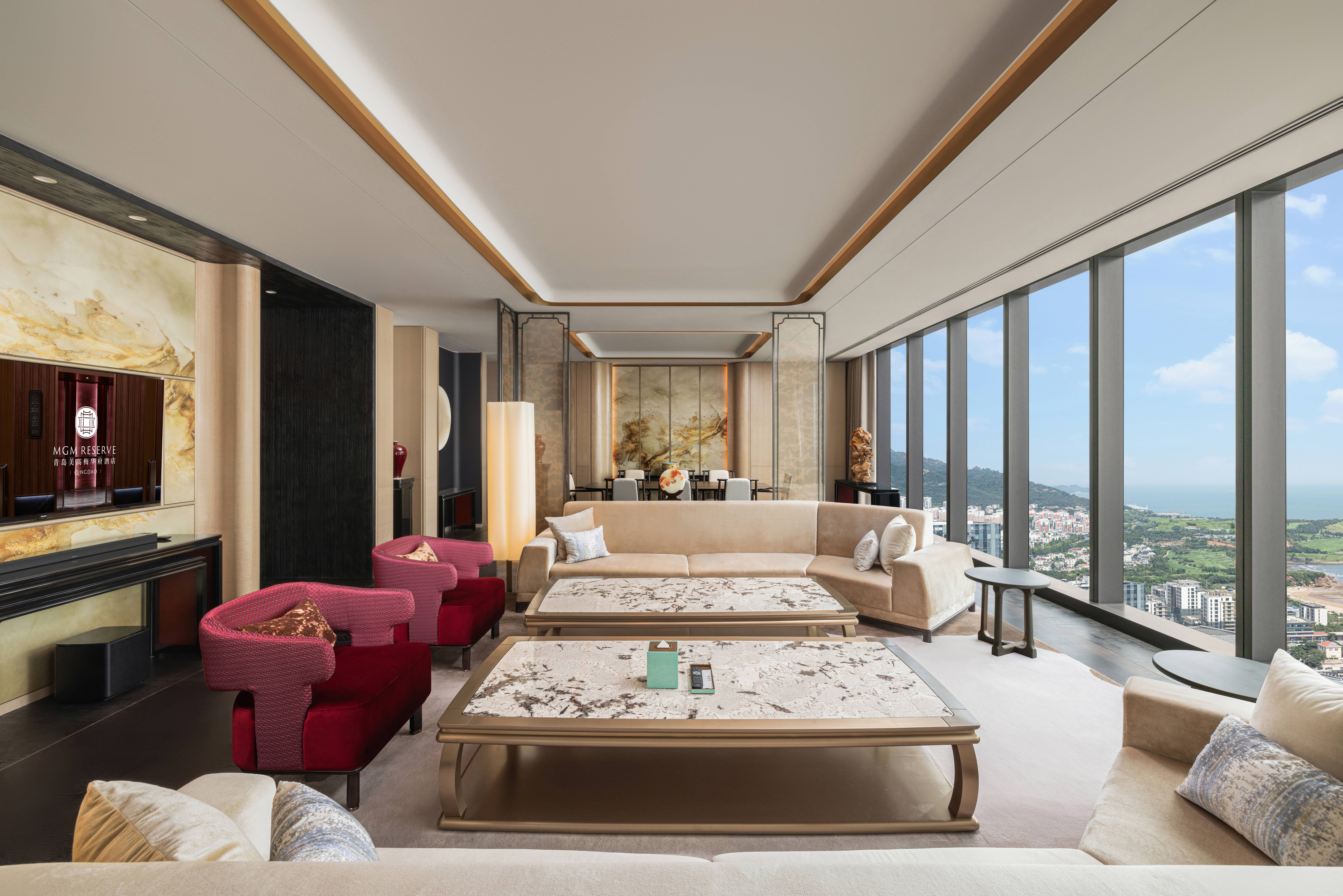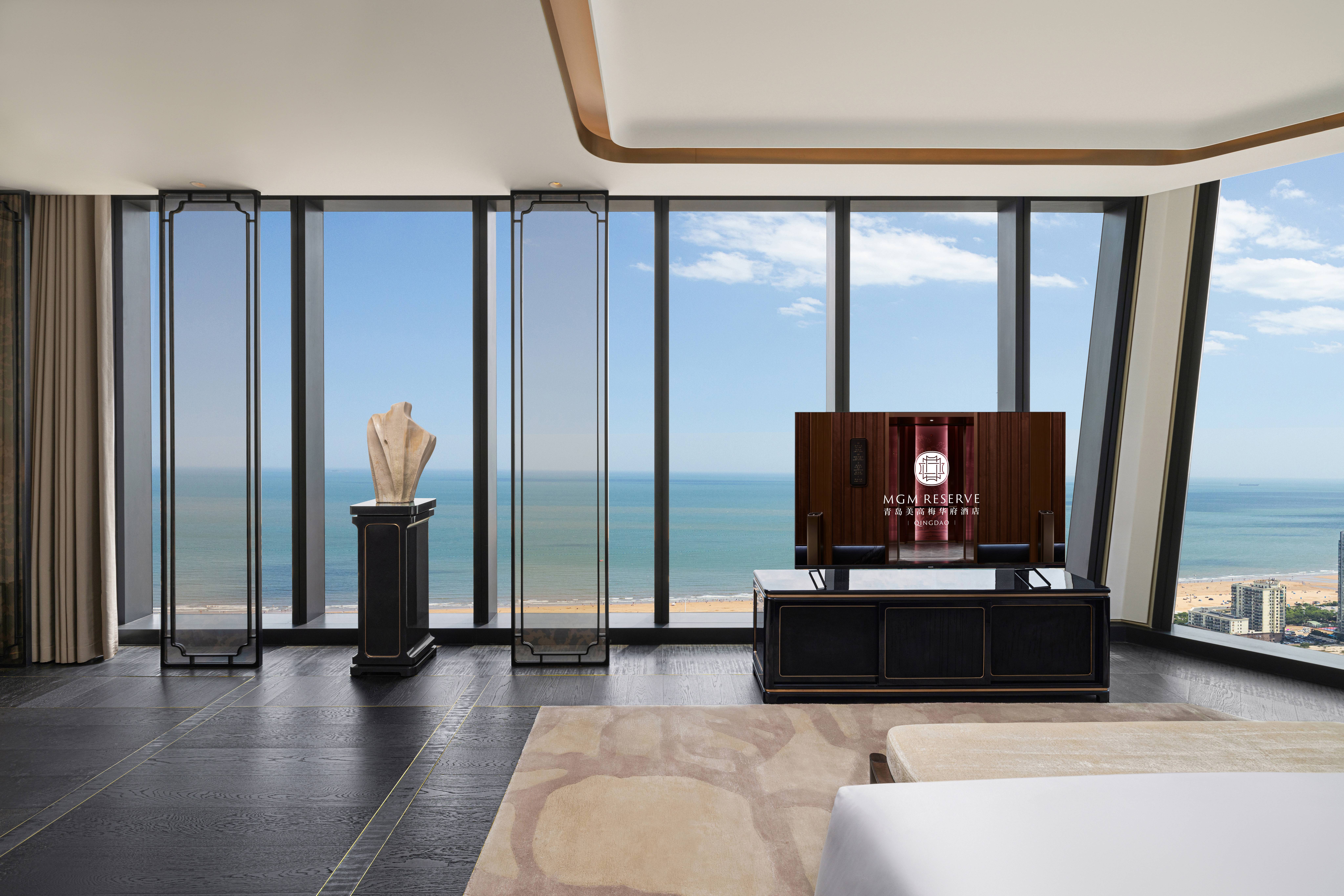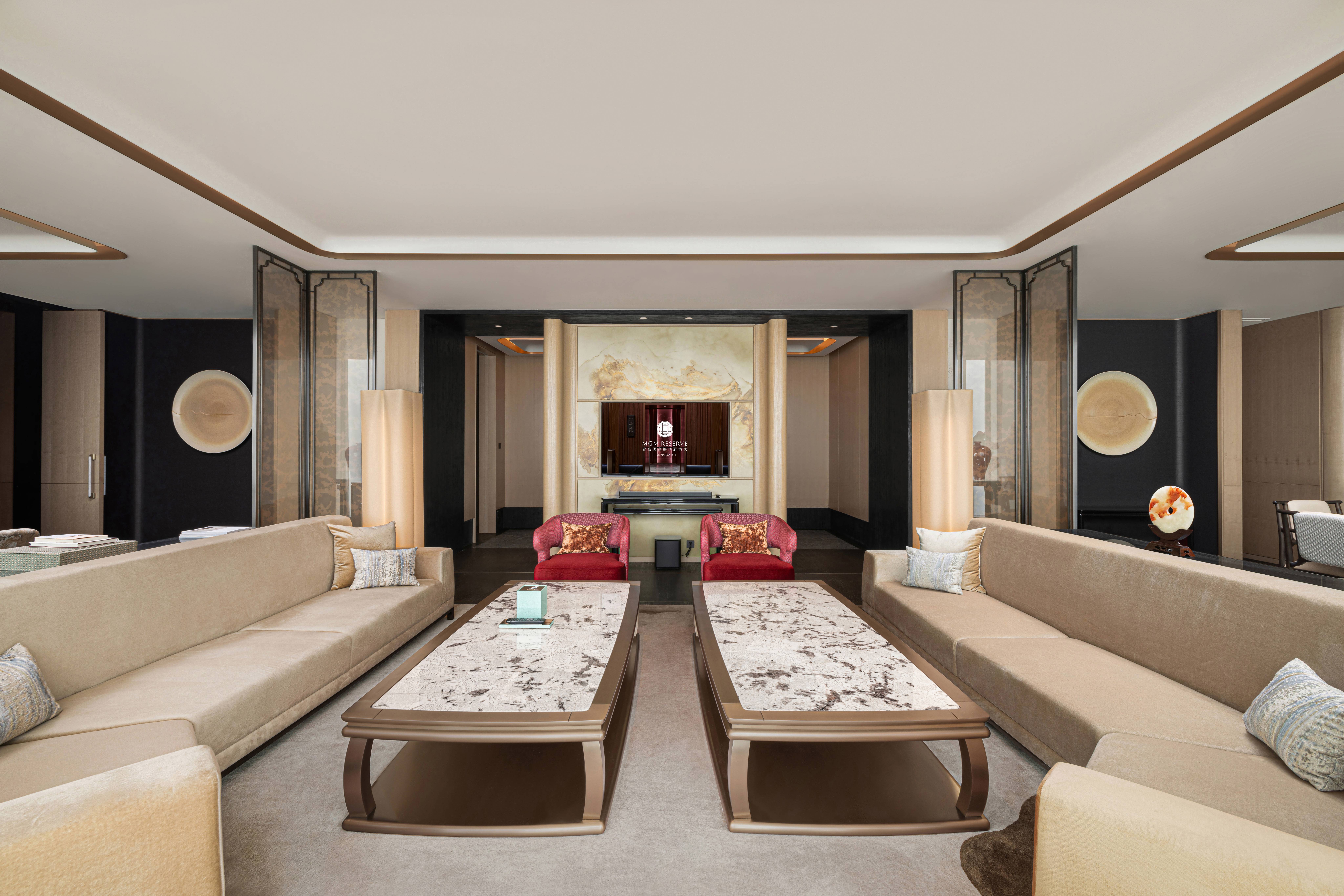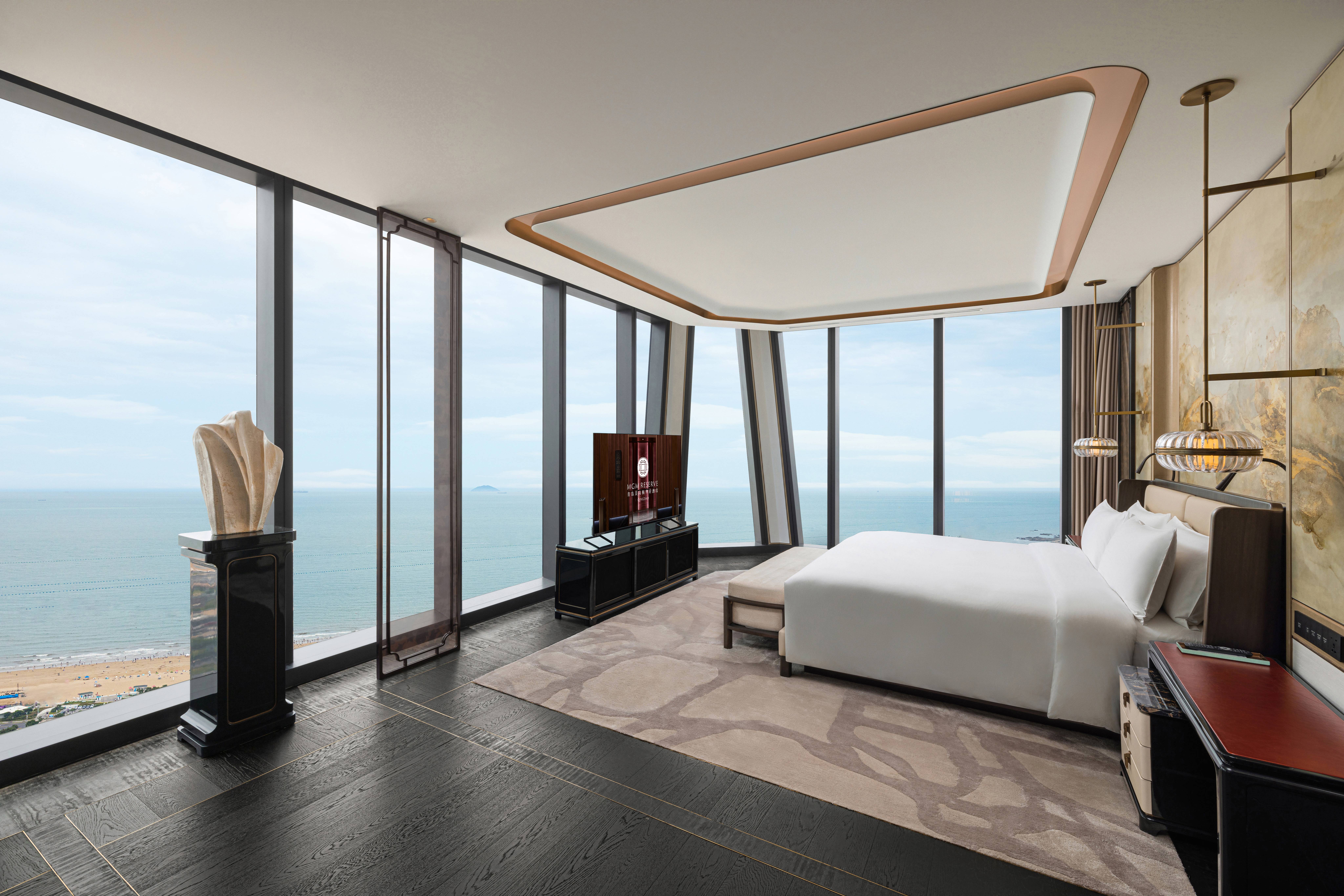 府邸生活家套房310m²起,这里是宾客远离城市喧嚣的精致居所。 套房可俯瞰青岛金色沙滩、浩淼海天、云雾崂山以及城市景观。极目远眺,望见碧蓝的海,感受坠入海风的轻松;环视四周,身处品质套房,体会极致的温馨与服务。从屋外到屋内,皆是一场恬静惬意的修行。 套房拥有新中式古典美感的独立的会客室、卧室、衣帽间和卫生间,结合深色细纹的地毯,独具设计感的家具尊雅堂皇,诠释了奢华的真谛。客房设有一张雍容舒适的大床或两张宽敞的大双人床,阳光洒入房间,含蓄雅致的中国文化韵味淡然而出。浴室以明丽的黑白色大理石打造,