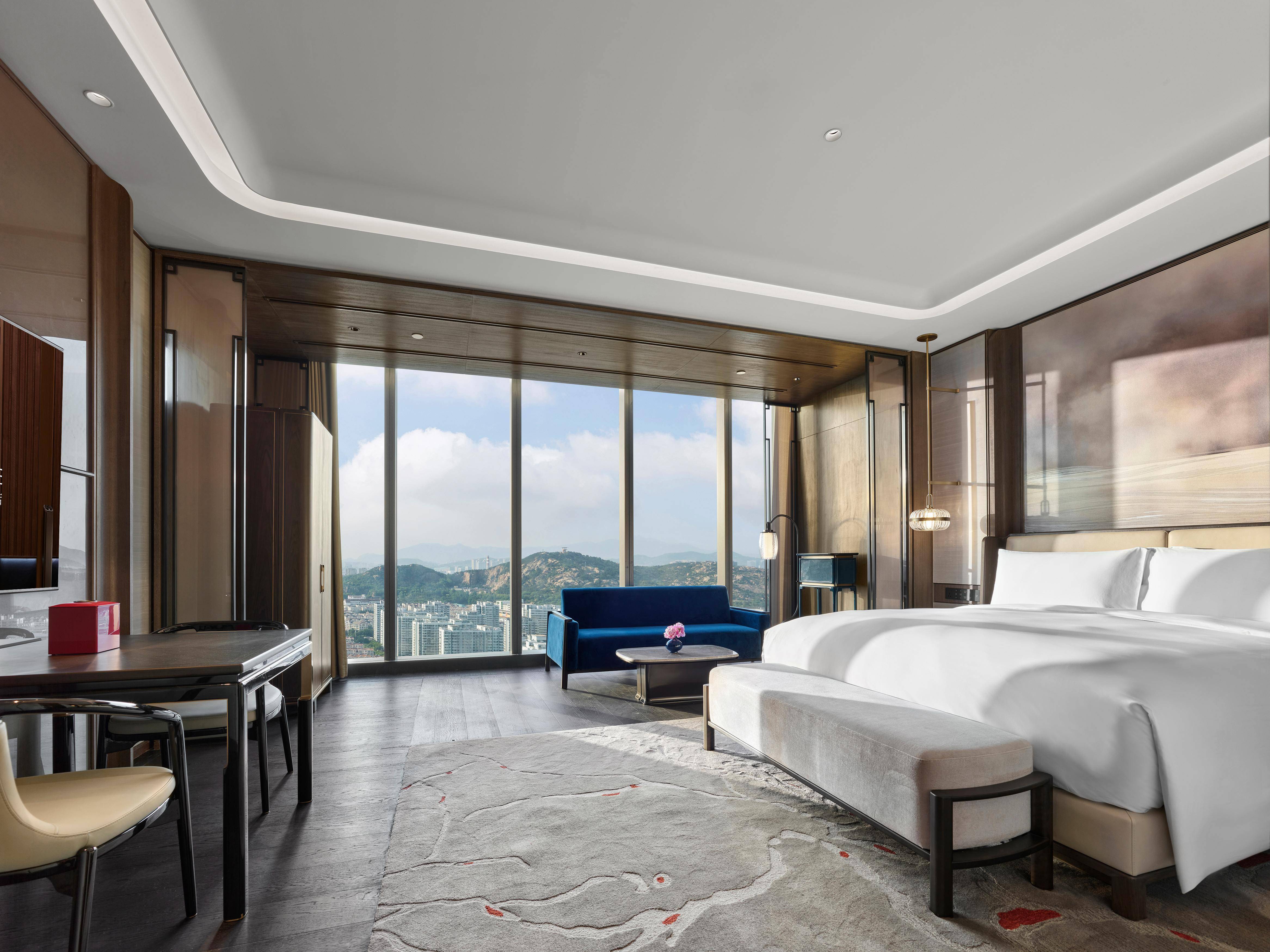 拥有55㎡以上面积的府邸城景客房,是这座滨海度假城市优质的旅居选择。宽幅玻璃窗可纵瞰青岛金融城绮丽的城市街景与远处的崂山青翠之姿。室内环境雅致,以海洋蓝、夕阳金和中国红主题色搭配出尊贵的东方色彩气韵。搭配精致的家具和高雅的步入式衣帽间,并巧妙地将青铜材质点缀在设计细节中,尽显雅质与尊贵。房间设计注重居住感的体验和细节的考究,宾客在阅尽繁华之后,于此大隐之地彻底享受身心的放松。