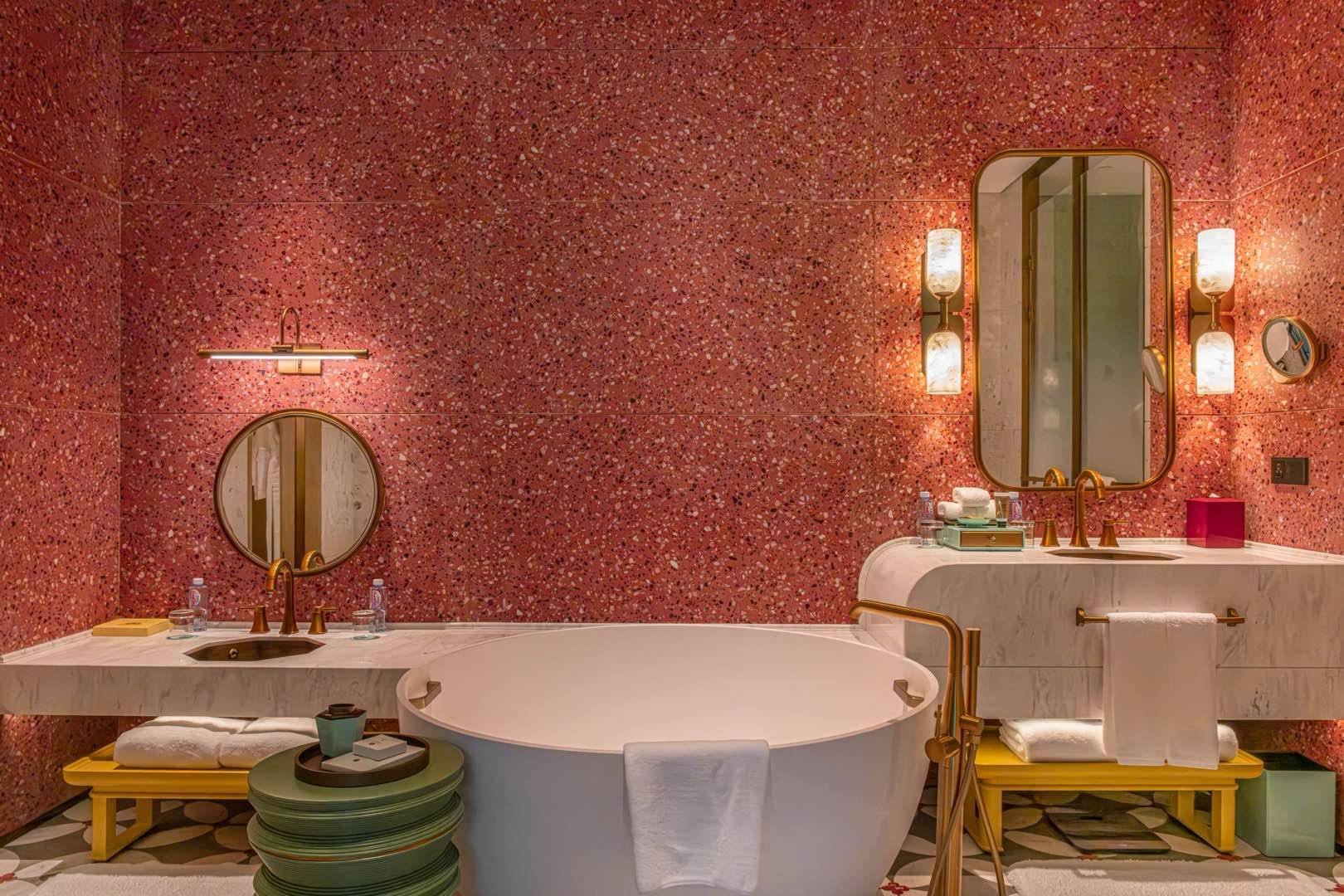 房间内自带庭院尽览园林秀美景致,恰宜雅聚小酌漫谈浮生。宽敞的步入式衣帽间内设有雅致的梳妆台,既显典雅又兼具实用性。整个空间洋溢着童趣与当代中国风韵的设计元素,高品质的设施与艺术品点缀其中,精致的器皿错落有致地陈列于房内,使宾客在放松身心、沉浸山林之际,亦能感受艺术对心灵的润泽。